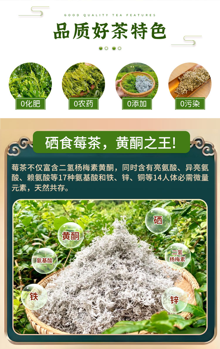 采用传统手工工艺,充分保留莓茶营养物质。我们平常制茶的那几天,平均一天只能睡到3个小时,一批茶做出来,需要连续20多个小时盯在那里,这样做出的茶,口感、内含富硒黄酮(二氢杨梅素)都很丰富。条索紧密,白霜均匀,茶汤黄绿透亮,入口微苦,而后回味甘甜,满口生津。这才是正宗品质上乘的土家龙须芽尖莓茶!